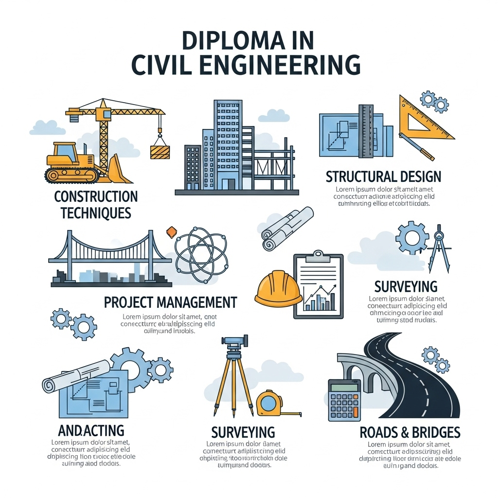 Graduates are prepared for roles such as Junior Engineers, Site Supervisors, Surveyors, Estimators, and Technicians in construction firms, government agencies, infrastructure companies, and consultancy firms. The diploma also serves as a foundation for further studies like a Bachelor’s degree in Civil Engineering.